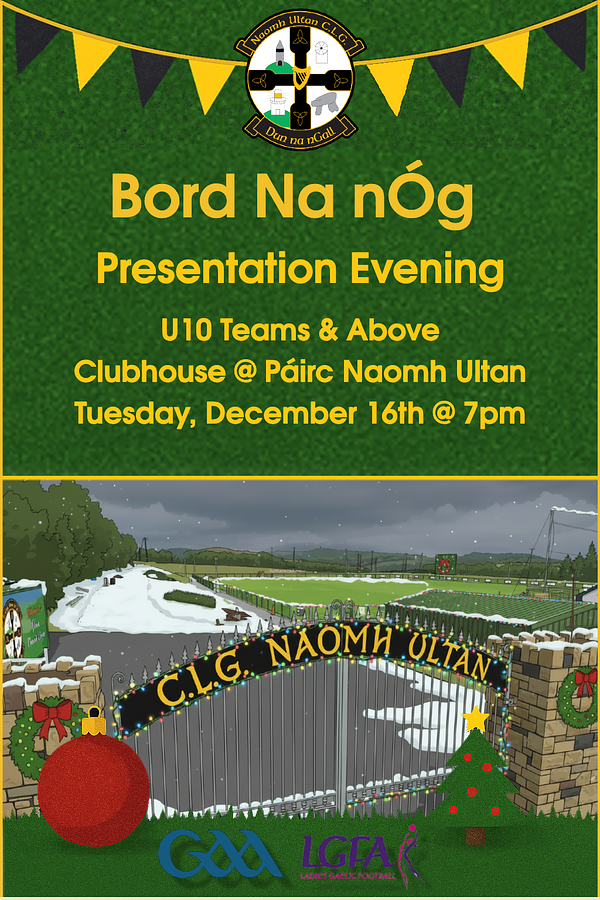CLG Naomh Ultan is excited to host our Bord Na nรg Presentation Evening for U10 players and above over the festive season. Join us at the clubhouse in Pรกirc Naomh Ultan at 7pm as we celebrate the hard work and achievements of our young players!