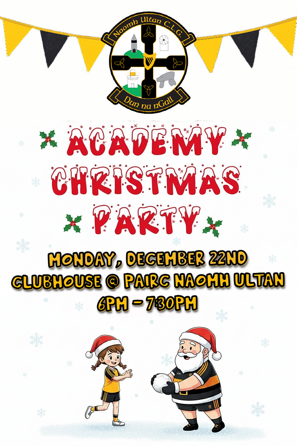 CLG Naomh Ultan is excited to host our Academy Christmas Party over the festive season! The party will take place for all our academy players from 6pmโ7:30pm on Monday, December 22nd in the clubhouse at Pรกirc Naomh Ultan.
