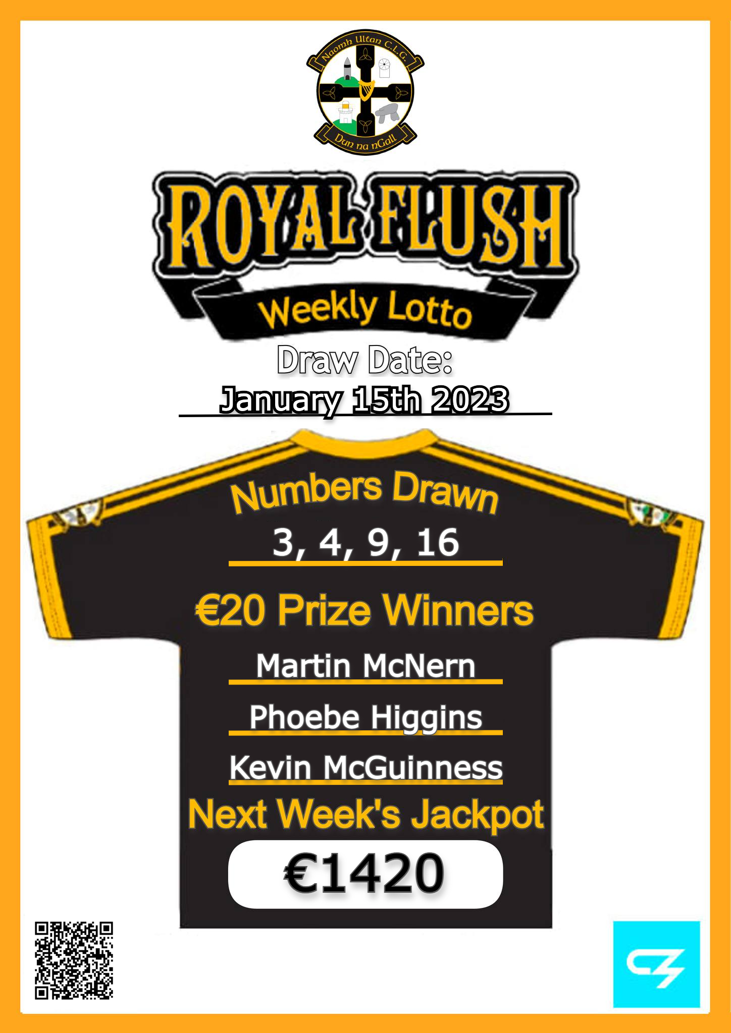 Royal Flush Lotto results for 15/01/2023 were 3, 4, 9 & 16. There was no winner of the jackpot of €1400, consolation prizes went to Martin McNern, Phoebe Higgins & Kevin McGuinness. Next week's jackpot now stands at €1420.
