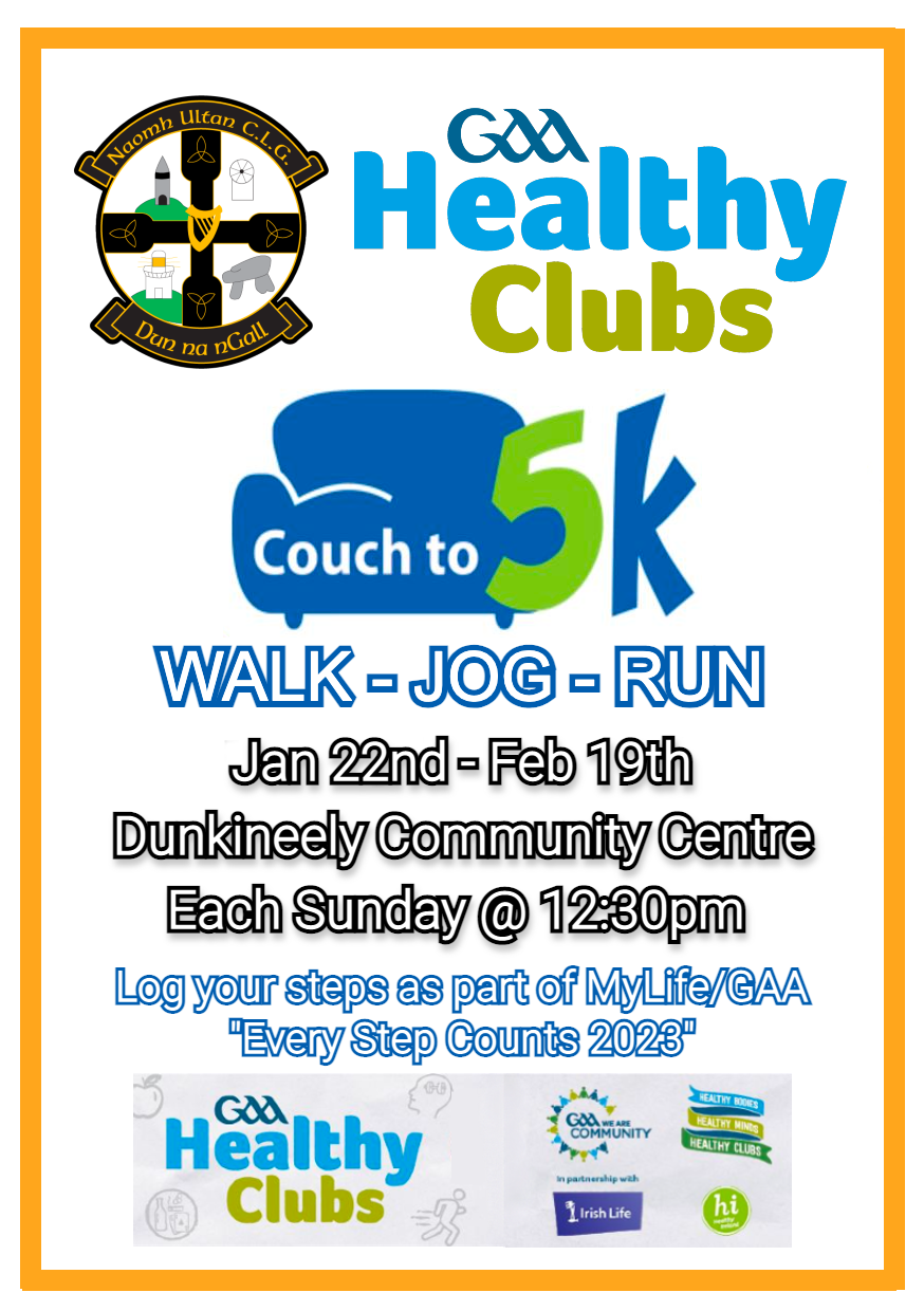 As part of the GAA Healthy Clubs Project we'll be running a Couch to 5k for 5 weeks. From this Sunday, January 22nd to February 19th at 12:30pm starting at Dunkineely Community Centre you can walk, jog or run our 5km route.