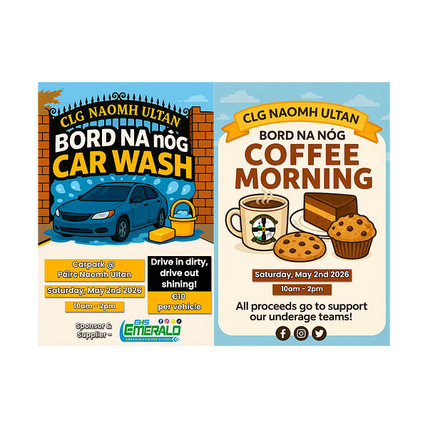 Join us on the May Bank Holiday Saturday for a fun-filled day supporting our Bord Na nรg teams with a Car Wash & Coffee Morning at Pรกirc Naomh Ultan!